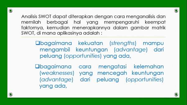 Salah satu strategi yang digunakan dalam upaya meningkatkan kegiatan keagamaan adalah dengan melakukan Analisa SWOT.